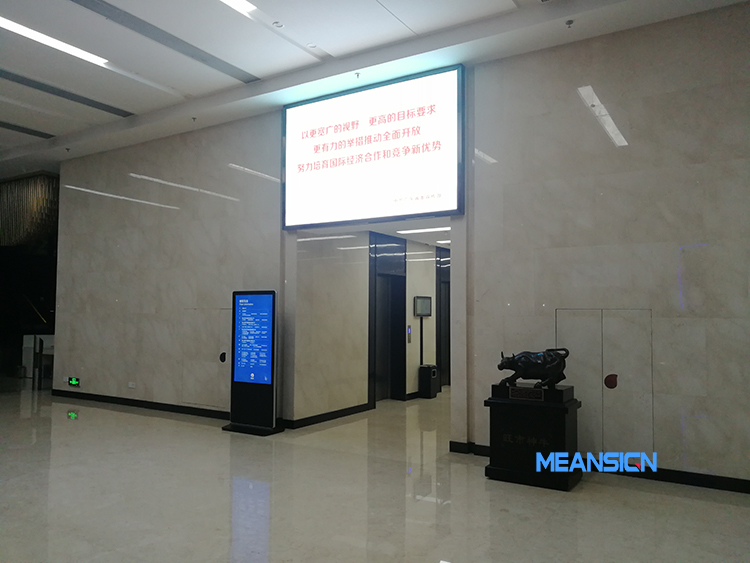 在辦公大樓大廳電梯乘坐入口處擺放落地式廣告一體機(jī),外觀大氣簡(jiǎn)約美觀,科技感十足,代替?zhèn)鹘y(tǒng)的標(biāo)識(shí)牌,展示寫字樓樓層導(dǎo)視,為來(lái)訪人員提供正確的樓層指引,彰顯集團(tuán)的大企業(yè)風(fēng)范。壁掛廣告一體機(jī)安裝在墻壁上,播放企業(yè)文化、企業(yè)宣傳片、企業(yè)通知公告、以及一些歡迎蒞臨指導(dǎo)內(nèi)容等。